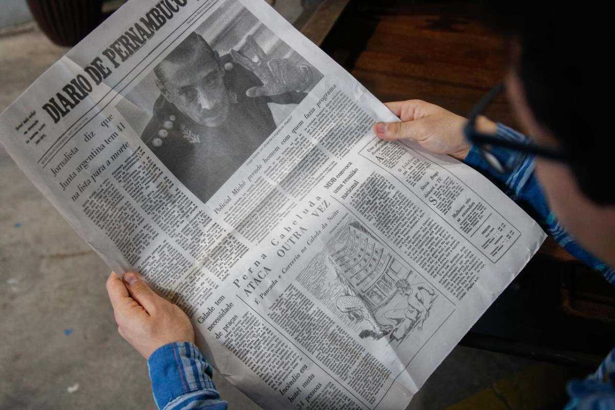 O Diario de Pernambuco é personagem de "O Agente Secreto" e marca a trama ao lado de outros elementos visuais, como a perna cabeluda, o fusca amarelo e a camisa da Pitombeira. (REPRODUÇÃO E VICTOR JUCÁ/DIVULGAÇÃO)